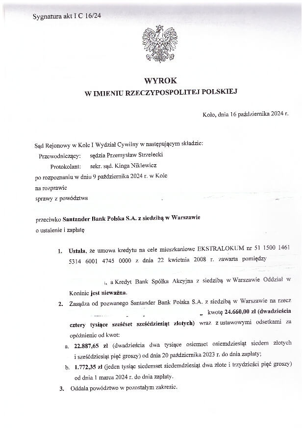 Jeśli wyrok się uprawomocni to Klienci nie będą dalej spłacać rat kredytu oraz otrzymają od banku zwrot nadpłaty z odsetkami.